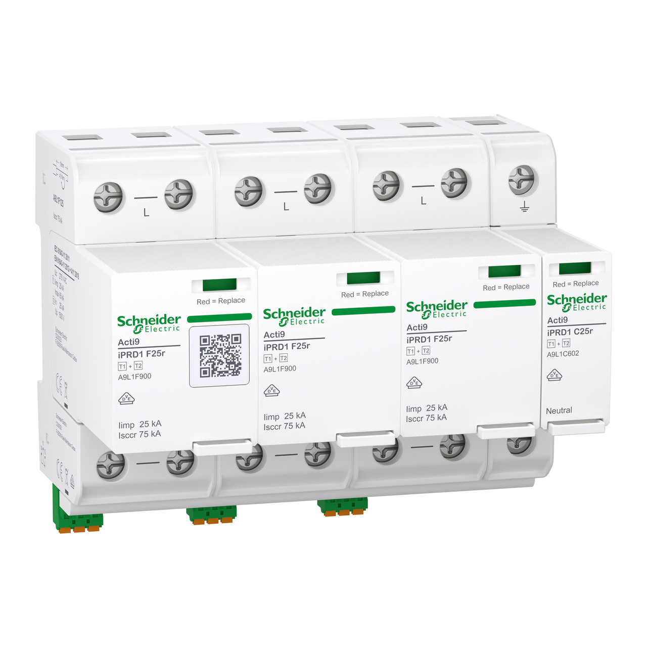 Surge arrester with pluggable cartridge, Acti9 iPRD1 F25r, 3P+N, 25kA, type 1+2, with fuse, with remote monitoring